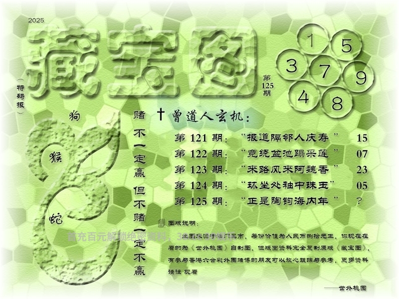 125期藏寶圖新:合向杨妃冢上生 老:沙上不闻鸿雁信 禁:马 禁:8尾 玄機字:《溷》